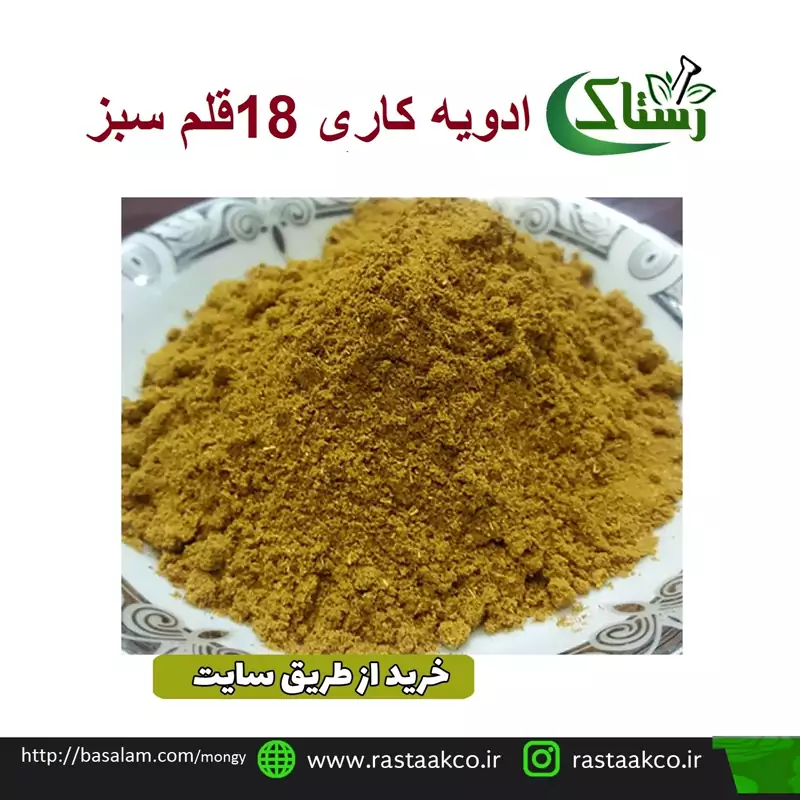 ادویه کاریادویه کاری 18قلم سبز یک ادویه پرکاربرد در آشپزی ایرانی است. این ترکیبی از ادویه های مختلف از جمله زیره، گشنیز، زردچوبه، زنجبیل، فلفل سیاه، دارچین و هل است. از این ادویه می توان برای طمع دهی به ابگوشت استفاده کرد....