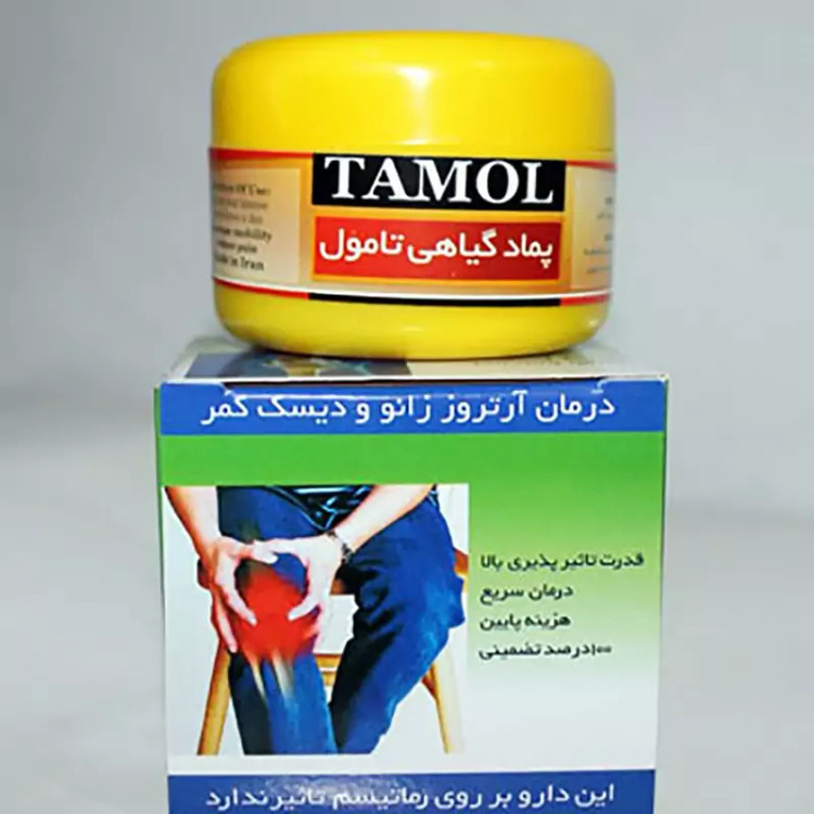 پماد گیاهی تامول : پماد گیاهی تامول : خواص پماد گیاهی تامول : ضد آرتروز زانو و دیسک کمر ،اسپاسم های عضلانی و دیسک کمر ،ضد درد وضد التهاب مفاصل . طریقه و مقدار مصرف پماد تامول : روزانه سه بار و هر بار مقداری از پماد را روی محل درد بمالید و به مدت پنج دقیقه ماساژ دهید . موارد منع مصزف : این برای روماتیسم و سائیدگی زانو تاثیری ندارد .تنها در بیمارانی که مبتلا به سائیدگی زانو هستند باعث تسکین درد می شود . مواد موثره : گل بابونه ،گل آویشن ،سقز ،رزماری